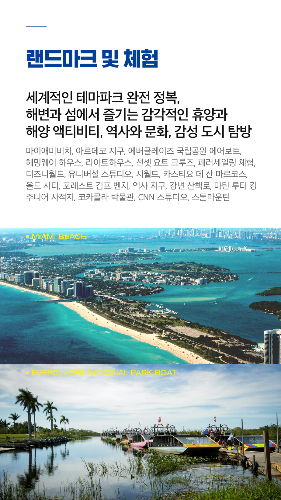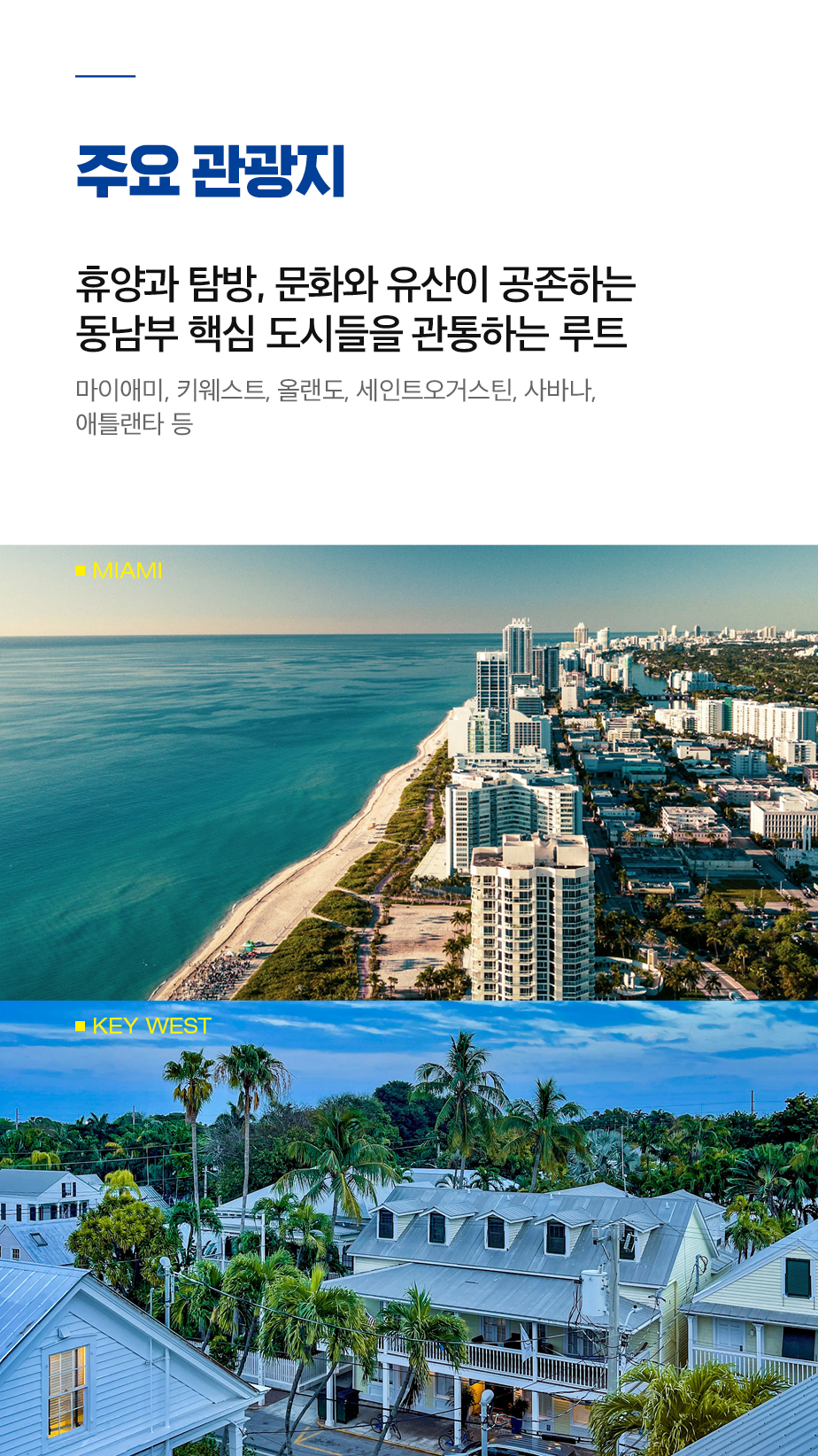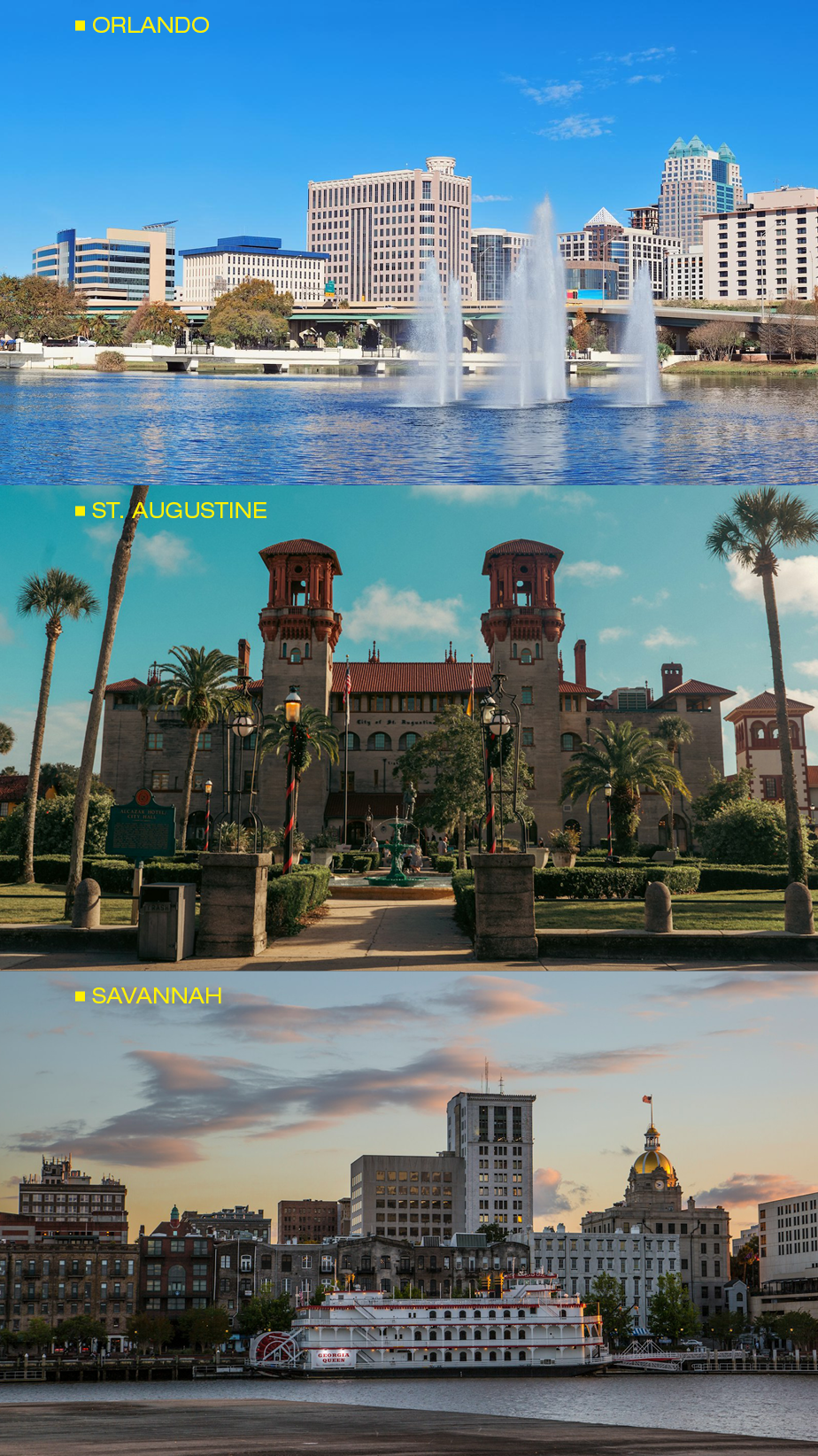 마이애미, 키웨스트, 올랜도, 세인트오거스틴, 사바나, 애틀랜타 등