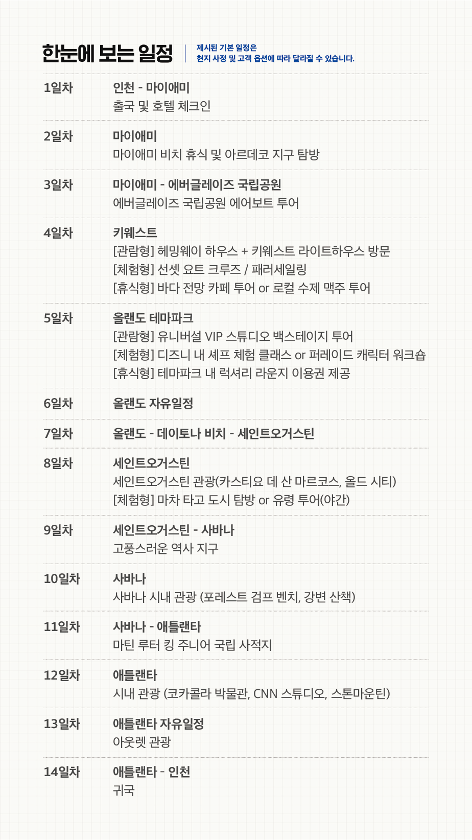 본 상품은 고객과 여행사가 직접 여행 루트와 일정, 가격 등을 조율해 나갈수 있습니다. 여행일 2개월 전에 마감하며 마감 후 여행신청시 환율 및 항공료 변동, 현지비용 상승에 따른 인상분에 의해 가격이 변동될 수 있습니다.
