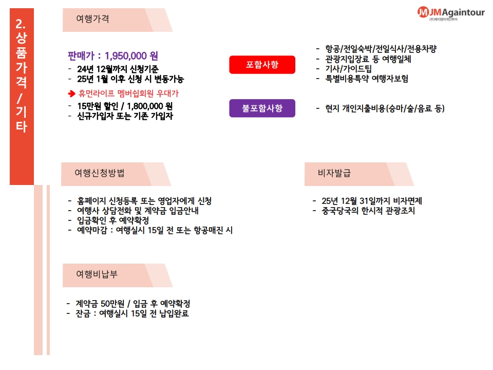 본 상품은 2개월 전에 마감하며 마감 후 여행신청시 환율 및 항공료 변동, 현지비용 상승에 따른 인상분에 의해 가격이 변동될 수 있습니다.