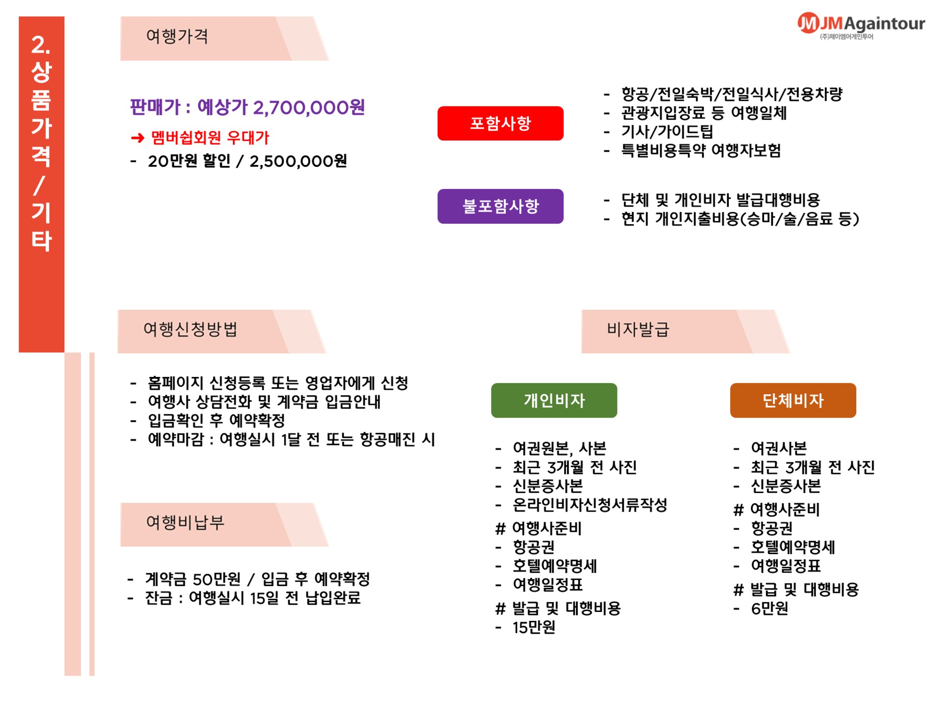 본 상품은 2개월 전에 마감하며 마감 후 여행신청시 환율 및 항공료 변동, 현지비용 상승에 따른 인상분에 의해 가격이 변동될 수 있습니다.