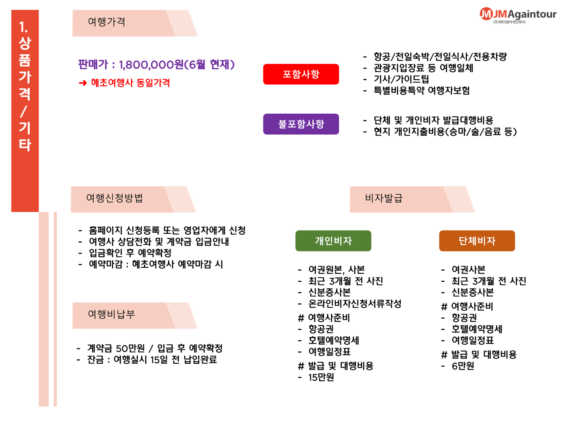 본 상품은 2개월 전에 마감하며 마감 후 여행신청시 환율 및 항공료 변동, 현지비용 상승에 따른 인상분에 의해 가격이 변동될 수 있습니다.